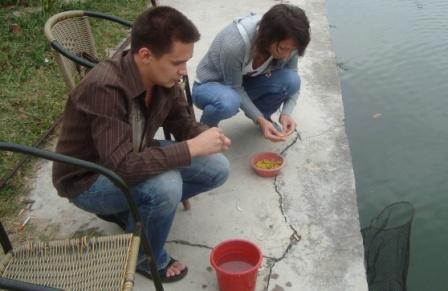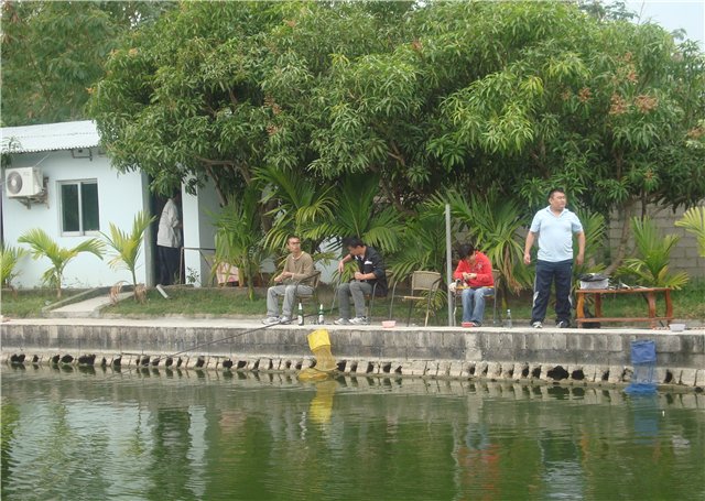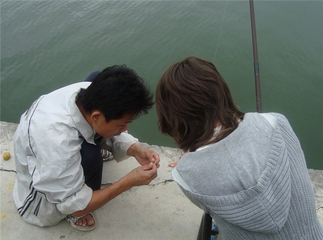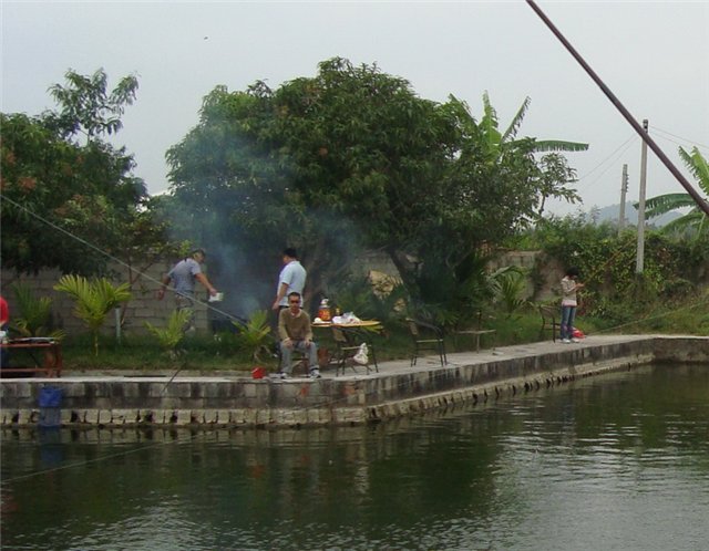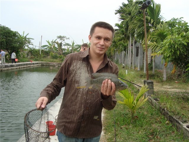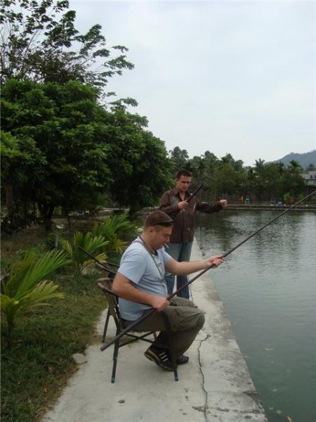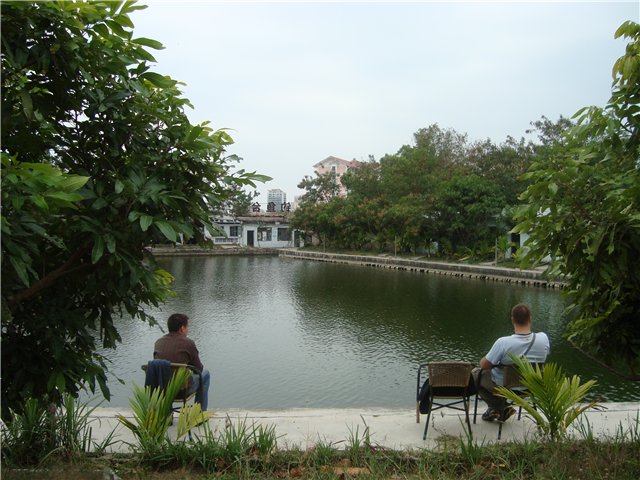 Рыбалка на озере в черте города. В общей сложности рыбалка заняла 3 часа, поехали мы под вечер, да и погода, оставляла желать лучшего. Но раз собрались, решили не отступать и разведать, что к чему. Озеро находится в 10-15 минутах езды от бухты Дадунхай в сторону аэропорта, напротив здания, где проходил конкурс "Мисс Мира", поворот на возвышенность, дорога ведет вдоль нищих китайских кварталов. Озеро оказалось искусственным прудом, с бетонными бортиками, по периметру которого расставлены стульчики для рыбаков.