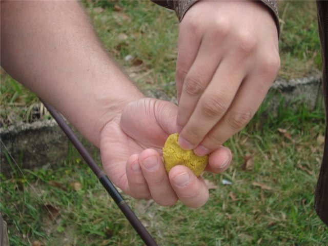 и две мисочки с наживкой. Ярко-желтого и красного цветов по запаху и консистенции напоминающая хлеб.