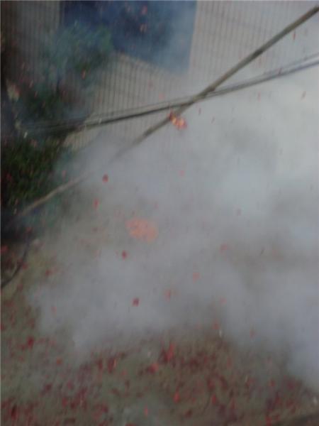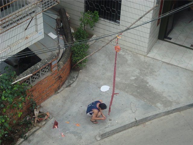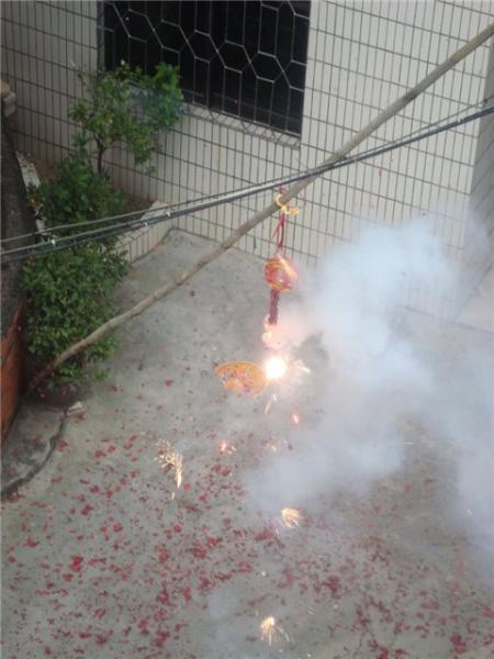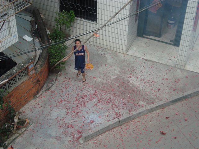 В нынешнем году, празднование пришлось на 25 января. Не буду рассказывать о массовых гуляниях китайцев и масштабных фейерверках, расскажу о традиции в Новый год отгонять злых духов посредством взрывания бомбочек. Наблюдения с балкона показали, что каждая уважающая себя хайнаньсая семья должна выйти на улицу и взорвать хоть одну гирлянду бомбочек. Мой сосед подошел творчески к этому процессу. Видимо, взрывать хлопушки на земле неинтересно, поэтому он закрепляет их на палке, а палку прислоняет к ....электрическому кабелю....