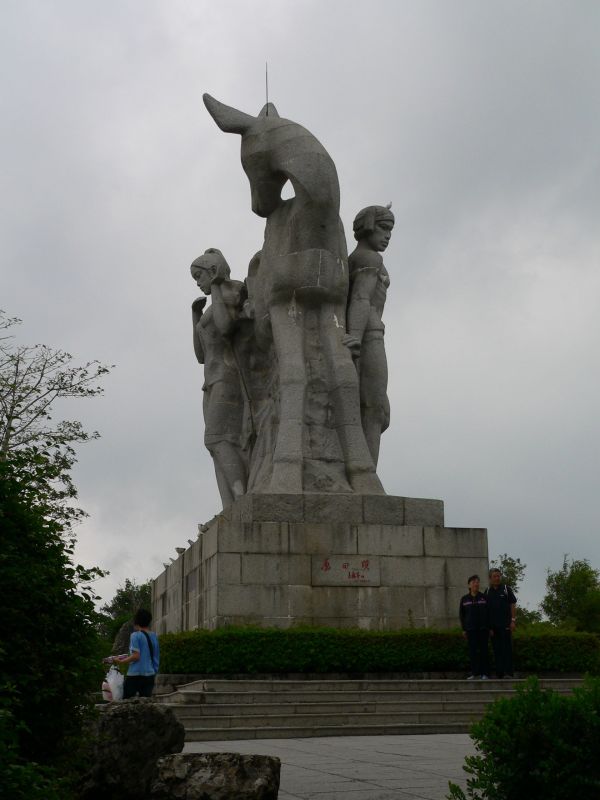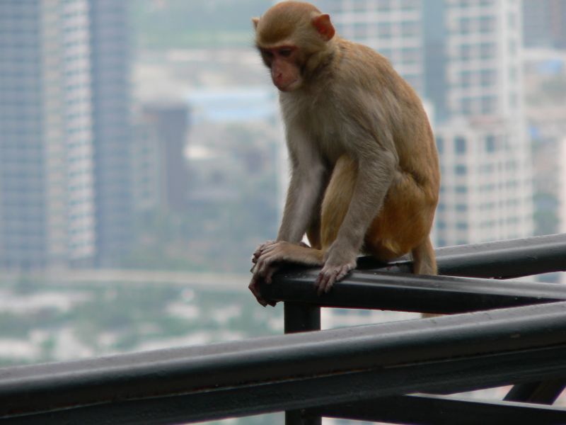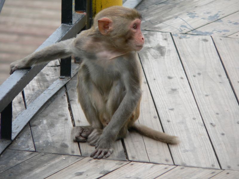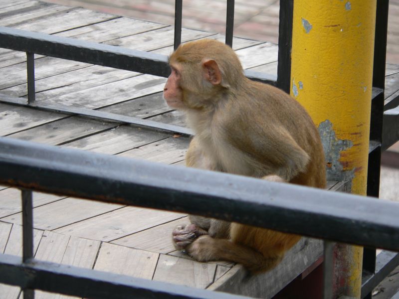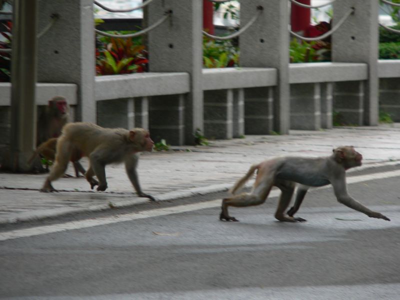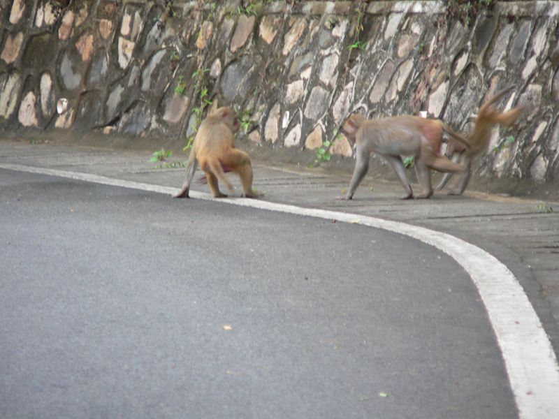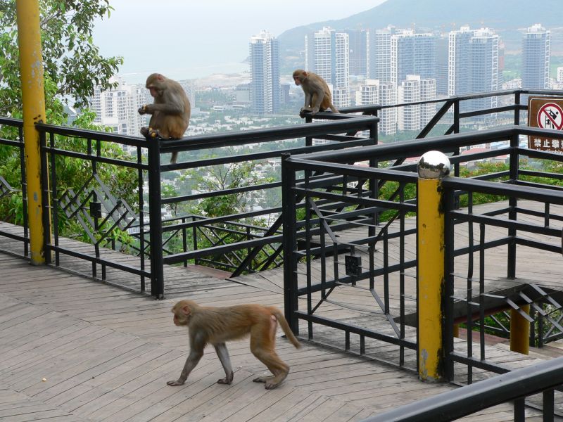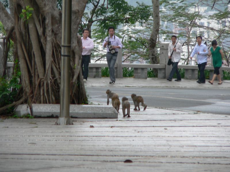 Немножко лоханулся я с фотоаппаратом - не хотел до верху вытаскивать из рюкзака. А тут из кустов выскакивает обезьяна! Дочь кричит - "Доставай банан!" - мы взяли несколько... Раскрываю рюкзак, даю банан. Это было не совсем правильное решение... Из лесочка вылазит еще обезьяна, потом еще, еще. Бананы быстро кончились - а обезьяны нет. С криками они атаковали дочь. Отбил. Отошли повыше по дороге, наблюдая как нам на помощь идут с низу любопытные китайцы. С ними до поры-времени было спокойно. Пока обезьяны не поняли, что больше им ничего не отломится