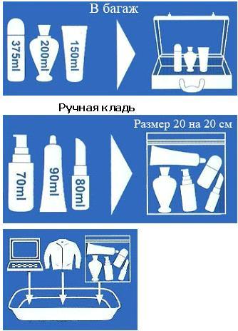 -Все емкости должны быть упакованы в прозрачные, запечатываемые пластиковые пакеты, общий объем жидкостей не должен превышать 1 л;