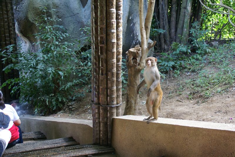Маленький островок весь покрыт деревьями, в ветвях которых живут десятки тысяч обезьян. Возле причала продают арахис, сласти, бананы, рубленый сахарный тростник — лакомства для угощения капризных потомков Сунь Укуна. Ведь большинство из них уже избалованы вниманием туристов и просто нахально требуют подношений. А если не получают желаемого — начинают гневаться и даже запугивать незадачливых посетителей наскоками, сердитыми выкриками, демонстрацией острых клыков. Гиды рекомендуют быть внимательным, когда идёшь под деревьями, — обезьянкам нравится прыгать на туристов и развлекаться их воплями. Сотрудники станции подзывают макак-резусов к специальным кормушкам и кормят их. Подкрепившись, обезьяны продолжают носиться по дорожкам, клянчить корм у туристов и качаться на ветвях в кронах деревьев.