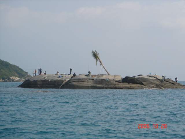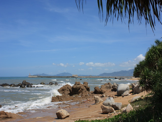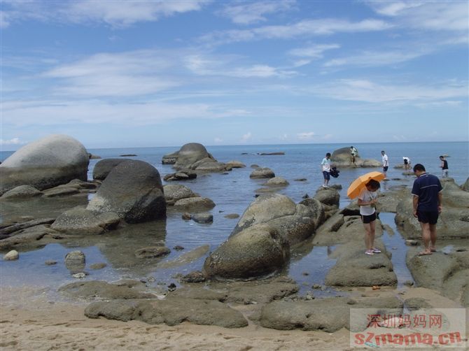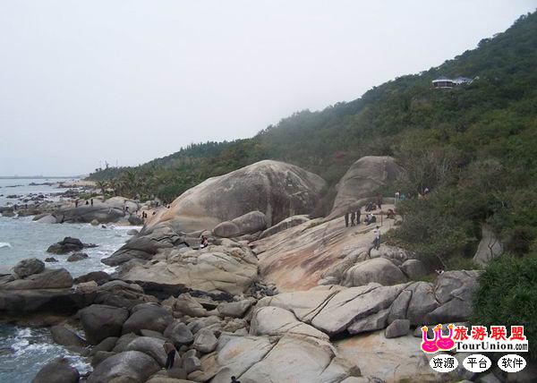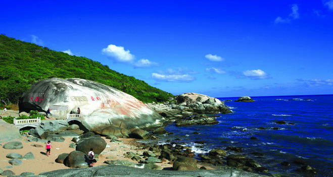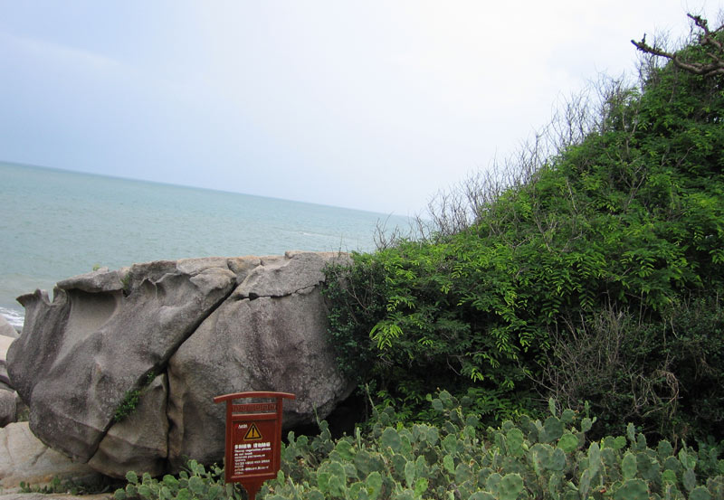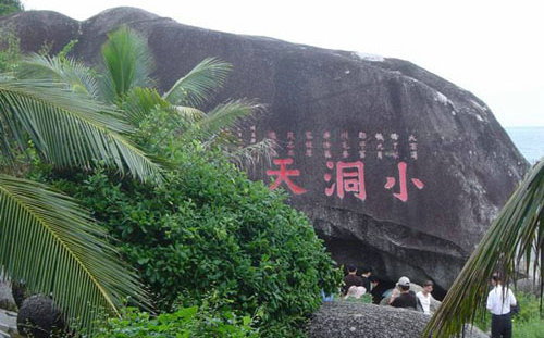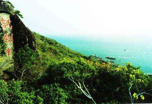 Скала, как бы рассеченная надвое, называется (скала пробы меча) по легенде, военачальники-покорители Хайнаня отачивали здесь свои клинки, и современные деятели приложили руку к камням. Сдесь свои клинки. и современные деятели приложили руку к камням. здесь выгравированы стихотворения Президента Академии наук Китая Го Можо. а так же бывшего предизента КНР Цзян Цземиня.