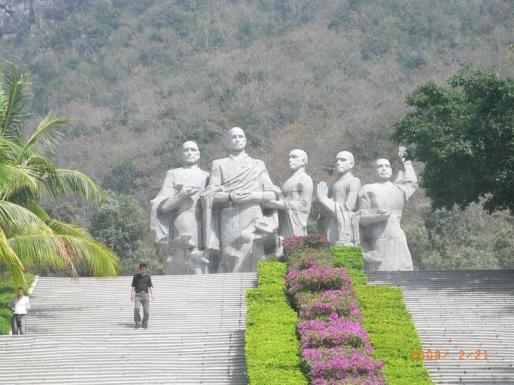 на зеленом склоне холма величественные каменные статуи буддиского монаха Цзянь Чжэня и четырех его учеников, смотрящих в море, которое вынесло их в далекие времена на этот берег. В том ,что буддиские статуи находятся в даосском парке, нет ничего удивительного, буддизм и даоссизм в Китае. по сути . не противоречат друг другу. и приверженци этих религий добиваются сходных целей. пусть и несколько разными методами