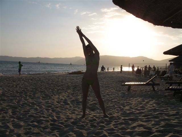 В первый солнечный день мы (а особенно я) обгорели. Мы были готовы к солнцу. Но Хайнаньское солнце в процессе отдыха нас просто сделало китайцами. Как загорают китайцы? Ответ: одетыми, в шапочках и под зонтом. Это факт. Для нас удивительный. Может быть, они боятся Хайнаньского солнца? (что и понятно). Но, я думаю, что это их так воспитала китайская культура. Да! И воды то они тоже боятся! Купаются в резиновых шапочках и обязательно со спасательным кругом. Купающиеся в море без кругов китайцы приравниваются к национальным героям. Вот, не поверите: был свидетелем такого чуда. Отдыхал рядом на пляже, на лежаке китаец. Долго спорил, видимо со своей супругой. Потом одел резиновую шапочку, очки, и пошел+ Подойдя к морю, минут пять разминался (я подумал: "неужели поплывет?"). Море в этот день было на редкость спокойным и теплым. Он помочил свои китайские подошвы... И... расстроился, вследствие чего удрученным побрел к своему лежаку. Результат: мы хохотали до ужина.